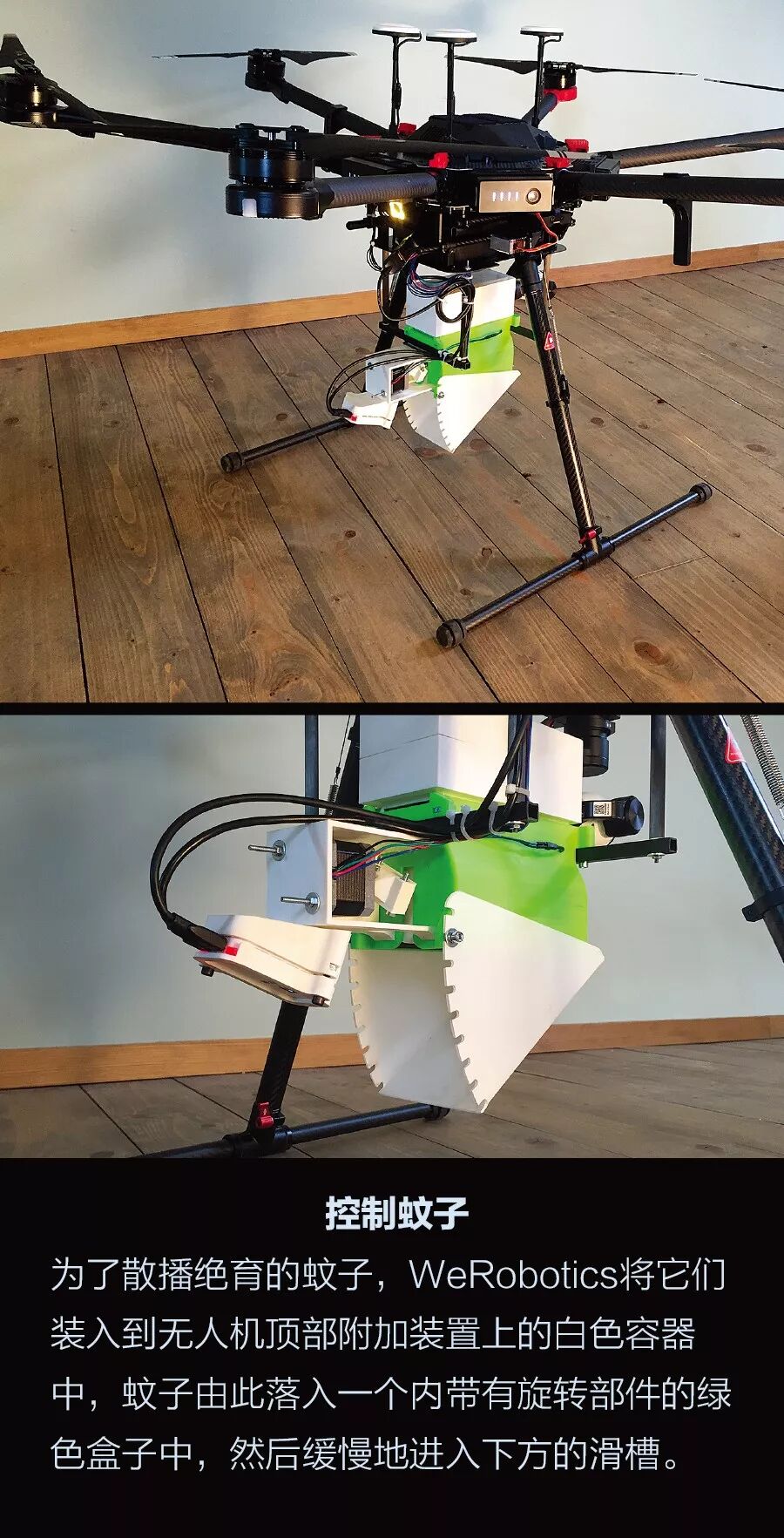 WeRobotics投放系统适用于不同种类的蚊子和任何型号的无人机。在未来的项目中,它运输和释放的蚊子可能是由于基因被修改或感染了沃巴赫氏菌而产生绝育后代的转基因雄蚊子,也可能是感染了沃巴赫氏菌的雌蚊子,这些蚊子在叮咬过程中不会传播疾病。